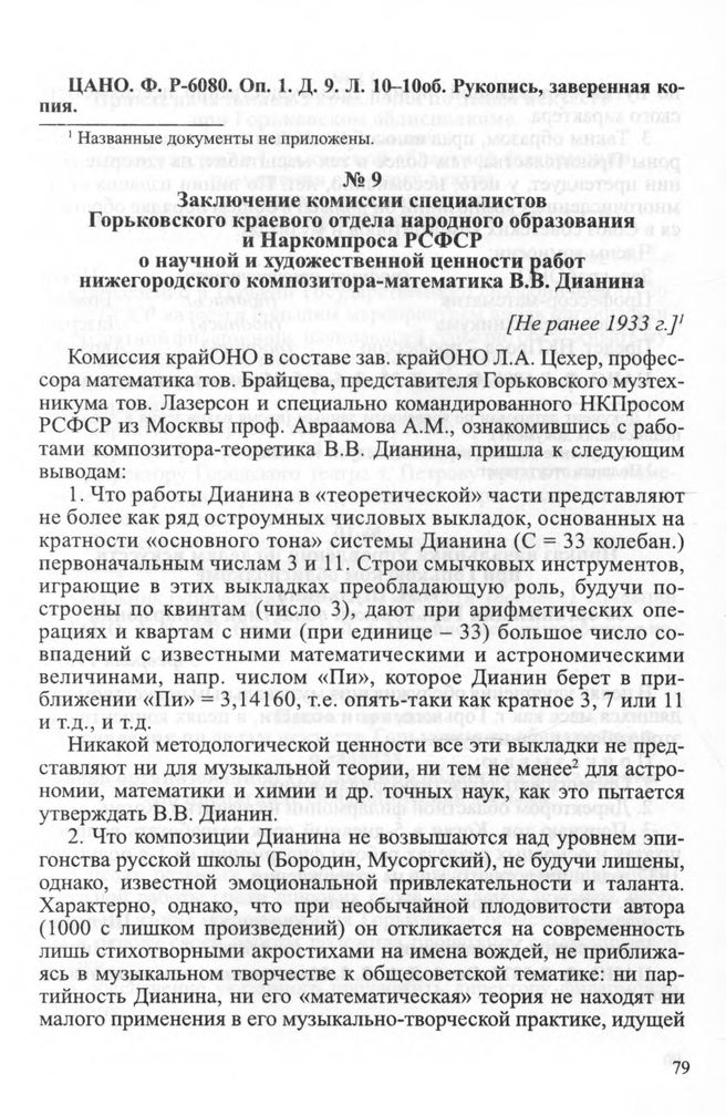 Заключение комиссии специалистов Горьковского краевого отдела народного образования и Наркомпроса РСФСР о научной и художественной ценности работ нижегородского композитора-математика В.В. Дианина. [Не ранее 1933 г.] // ЦАНО. Ф. P-6080. Оп. 1. Д. 25. Л. 6-6об. Машинопись, подлинник.
