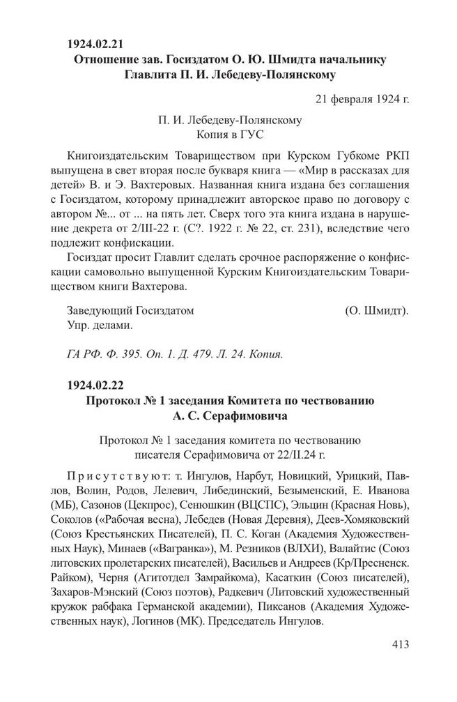 Протокол № 1 заседания Комитета по чествованию А. С. Серафимовича. 22 февраля 1924 г. // ГА РФ. Ф. 395. Оп. 5. Д. 36. Л. 40, 41–42. Машинописная копия.
