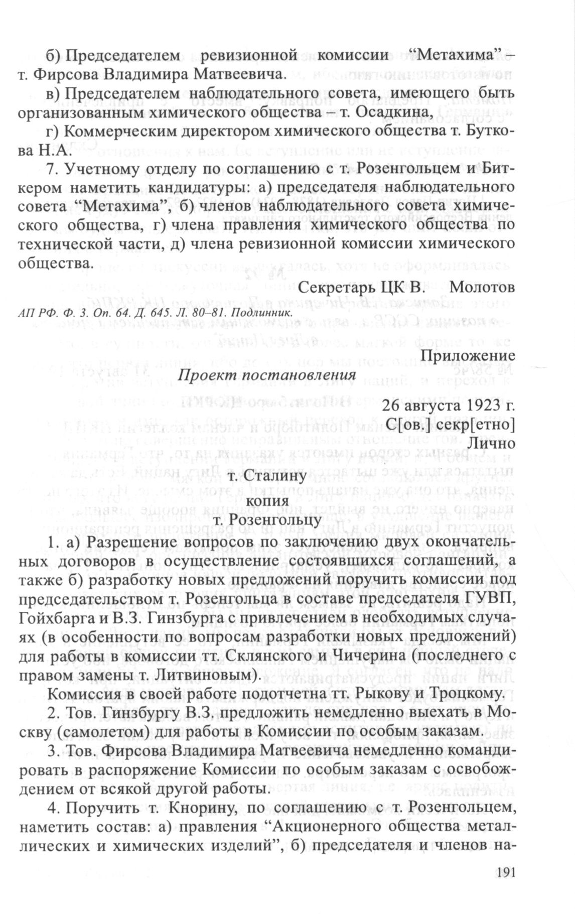 Приложение. Проект постановления. 26 августа 1923 г. // АП РФ. Ф. 3. Oп. 64. Д. 645. Л. 79. Подлинник.