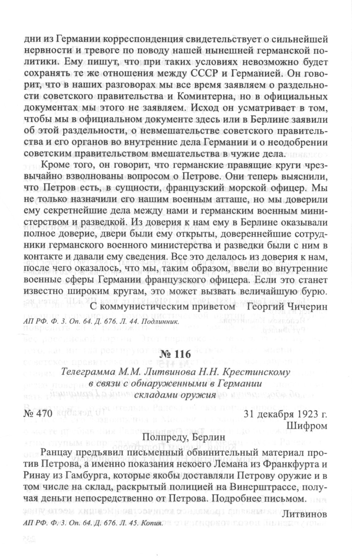 Телеграмма М.М. Литвинова Н.Н. Крестинскому в связи с обнаруженными в Германии складами оружия. 31 декабря 1923 г. // АП РФ. Ф. 3. Oп. 64. Д. 676. Л. 45. Копия.