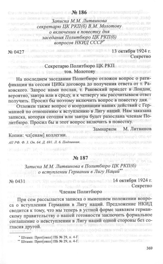 Записка М.М. Литвинова в Политбюро ЦК РКП(б) о вступлении Германии в Лигу Наций. 14 октября 1924 г.
