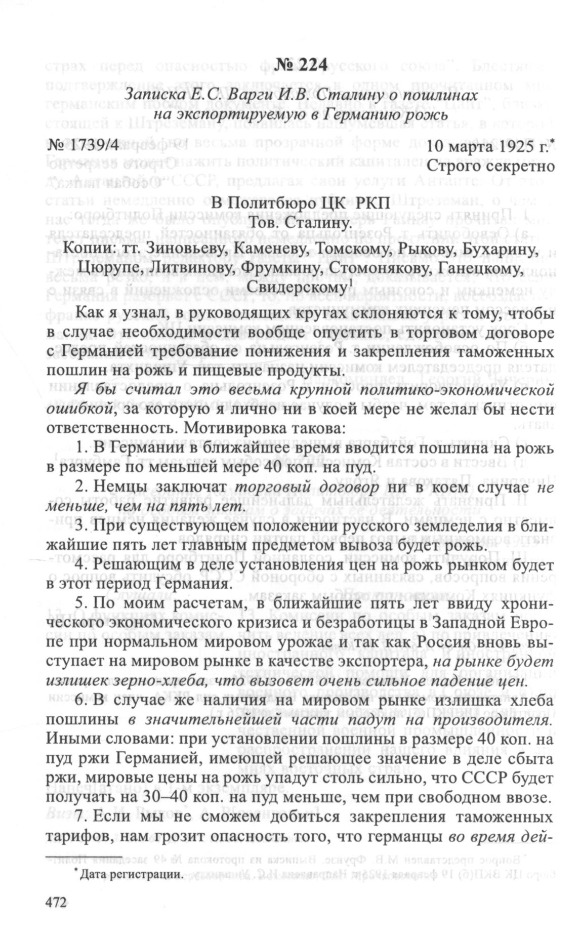 Записка Е.С. Варги И.В. Сталину о пошлинах на экспортируемую в Германию рожь. 10 марта 1925 г. // АП РФ. Ф. 3. Oп. 64. Д. 647. Л. 48-49. Подлинник.