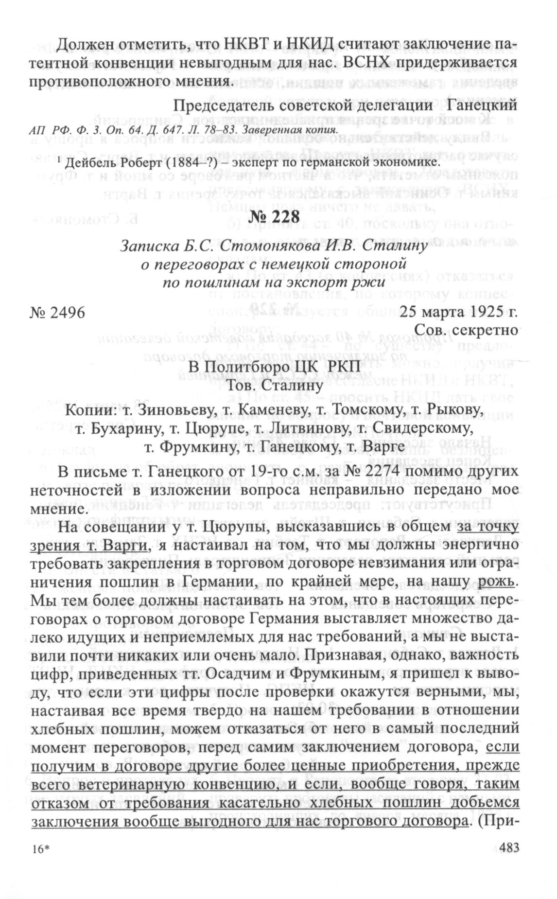 Записка Б.С. Стомонякова И.В. Сталину о переговорах с немецкой стороной по пошлинам на экспорт ржи. 25 марта 1925 г. // АП РФ. Ф. 3. Oп. 64. Д. 647. Л. 84-85. Подлинник.