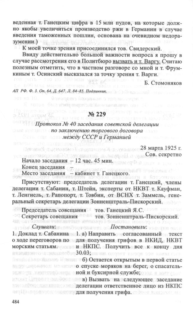 Протокол № 40 заседания советской делегации по заключению торгового договора между СССР и Германией. 28 марта 1925 г. // АП РФ. Ф. 3. Oп. 64. Д. 647. Л. 87-88. Заверенная копия.