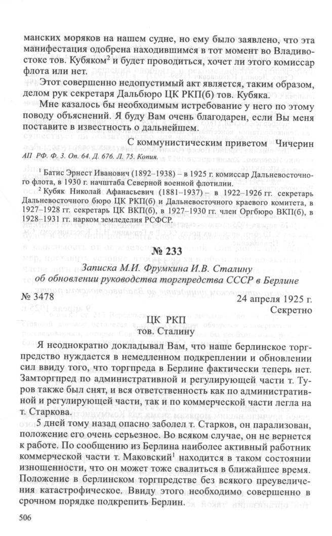 Записка М.И. Фрумкина И.В. Сталину об обновлении руководства торгпредства СССР в Берлине. 24 апреля 1925 г. // АП РФ. Ф. 3. Oп. 64. Д. 639. Л. 57-58. Заверенная копия.