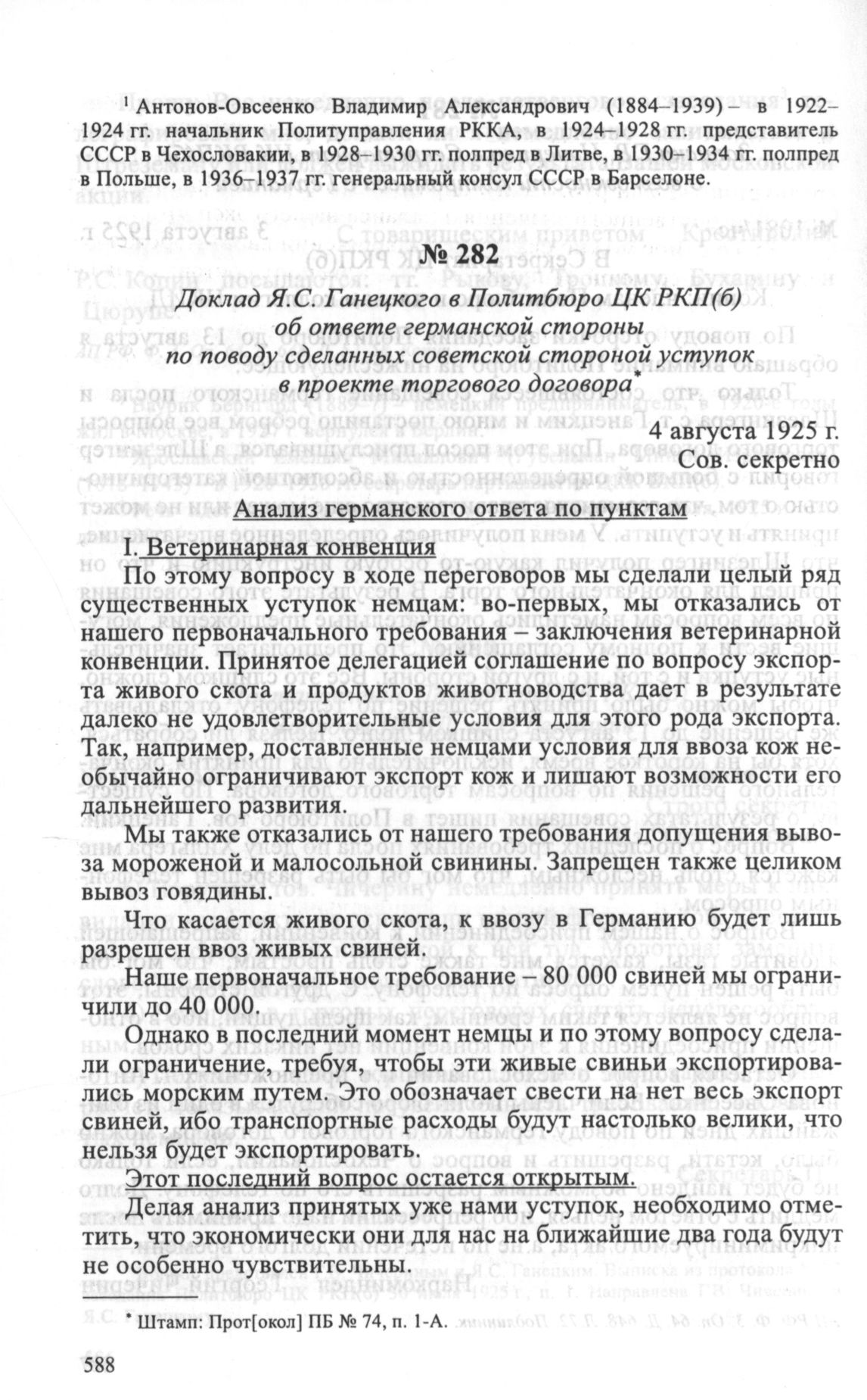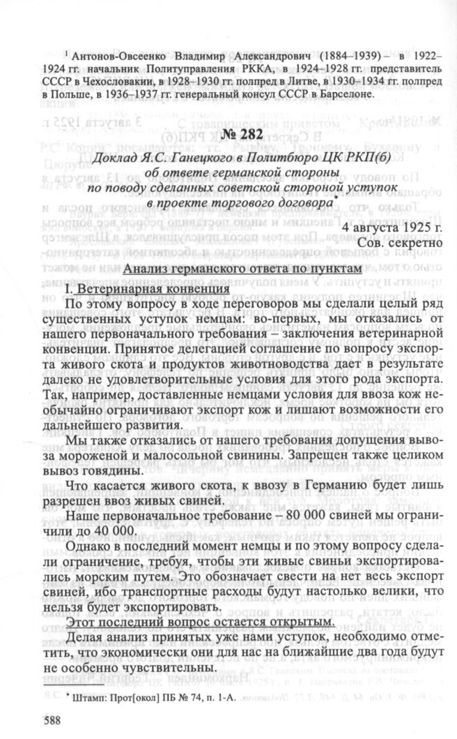 Доклад Я.С. Ганецкого в Политбюро ЦК РКП(б) об ответе германской стороны по поводу сделанных советской стороной уступок в проекте торгового договора. 4 августа 1925 г. // АП РФ. Ф. 3. Oп. 64. Д. 648. Л. 75-83. Подлинник.
