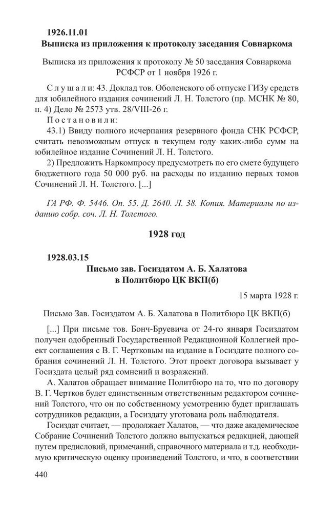 Выписка из приложения к протоколу № 50 заседания Совнаркома РСФСР от 1 ноября 1926 г. // ГА РФ. Ф. 5446. Оп. 55. Д. 2640. Л. 38. Копия. Материалы по изданию собр. соч. Л. Н. Толстого.