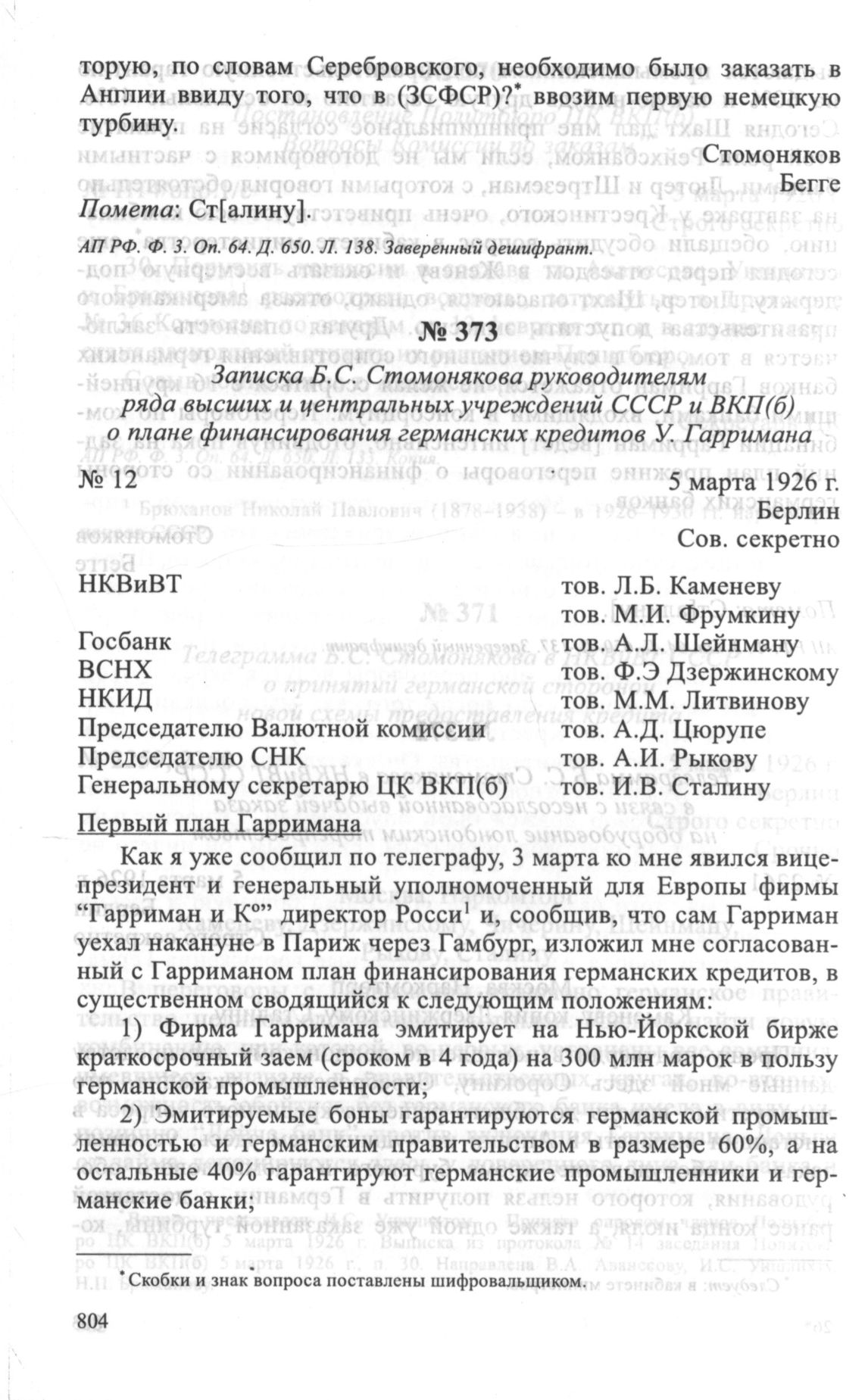 Записка Б.С. Стомонякова руководителям ряда высших и центральных учреждений СССР и ВКП(б) о плане финансирования германских кредитов У. Гарримана. 5 марта 1926 г. // АП РФ. Ф. 3. Оп. 64. Д. 650. Л. 117-132. Копия.