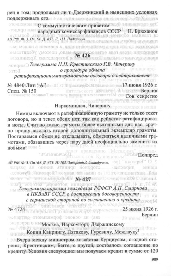 Телеграмма Н.Н. Крестинского Г.В. Чичерину о процедуре обмена ратификационными грамотами договора о нейтралитете. 17 июня 1926 г. // АП РФ. Ф. 3. Oп. 64. Д. 671. Л. 103. Заверенный дешифрант.