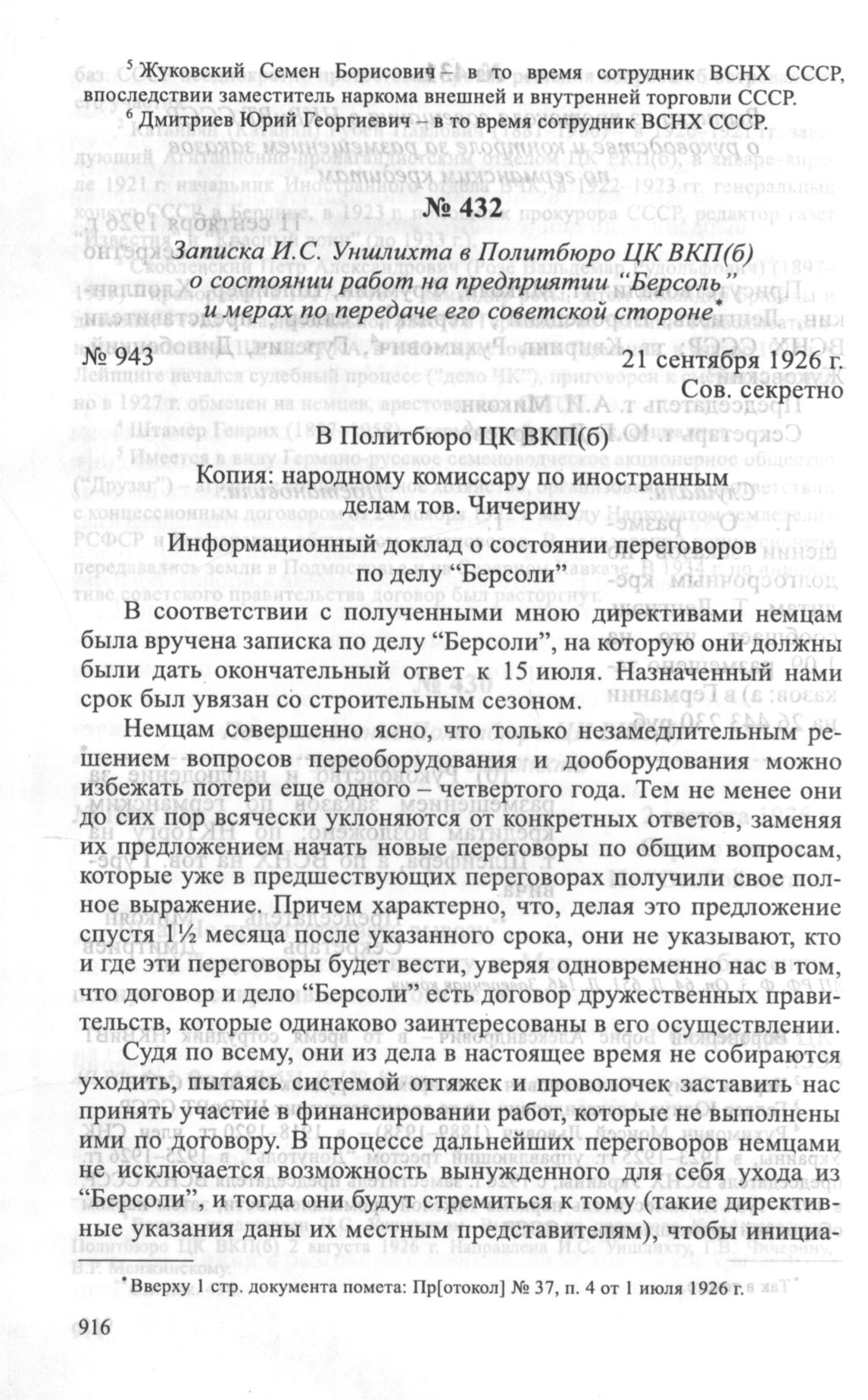 Записка И.С. Уншлихта в Политбюро ЦК ВКП(б) о состоянии работ на предприятии “Берсоль” и мерах по передаче его советской стороне. 21 сентября 1926 г. // АП РФ. Ф. 3. Oп. 64. Д. 651. Л. 148-148 об. Подлинник.