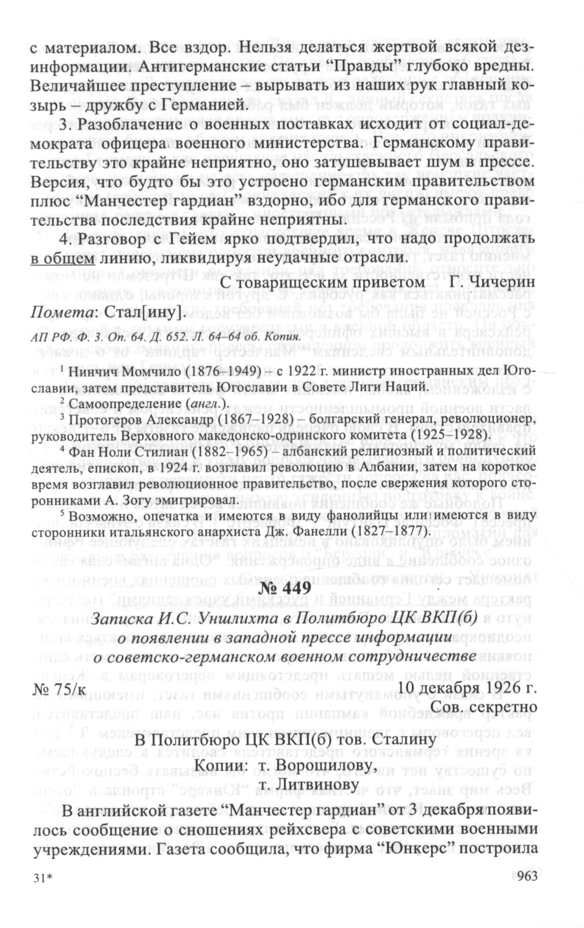 Записка И.С. Уншлихта в Политбюро ЦК ВКП(б) о появлении в западной прессе информации о советско-германском военном сотрудничестве. 10 декабря 1926 г. // АП РФ. Ф. 3. Oп. 64. Д. 652. Л. 66-68. Подлинник.