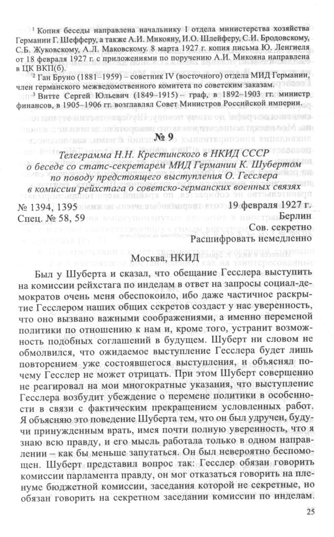 Телеграмма Н.Н. Крестинского в НКИД СССР о беседе со статс-секретарем МИД Германии К. Шубертом по поводу предстоящего выступления О. Гесслера в комиссии рейхстага о советско-германских военных связях. 19 февраля 1927 г.