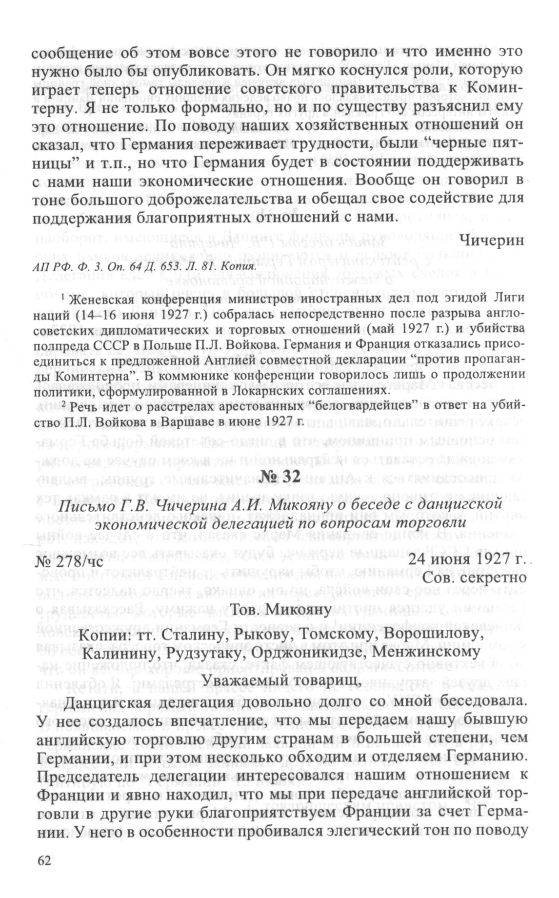 Письмо Г.В. Чичерина А.И. Микояну о беседе с данцигской экономической делегацией по вопросам торговли. 24 июня 1927 г. // АП РФ. Ф. 3. Oп. 64. Д. 653. Л. 85-86. Копия.