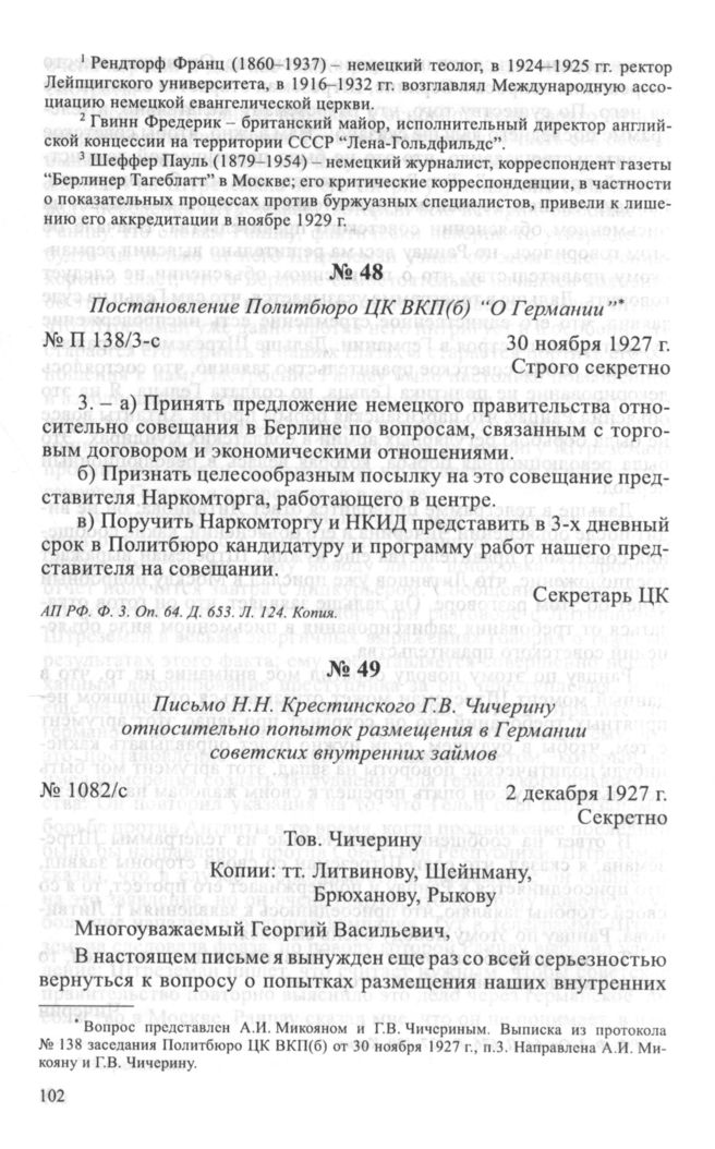 Письмо Н.Н. Крестинского Г.В. Чичерину относительно попыток размещения в Германии советских внутренних займов. 2 декабря 1927 г. // АП РФ. Ф. 3. Oп. 64. Д. 653. Л. 133-136. Копия.