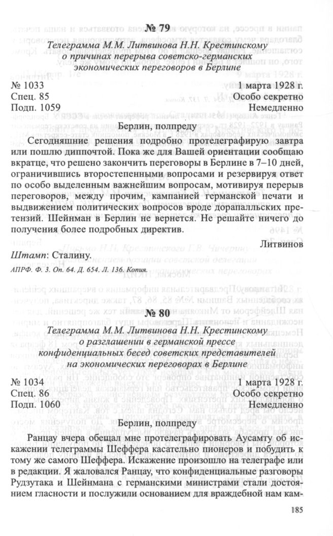 Телеграмма М.М. Литвинова Н.Н. Крестинскому о причинах перерыва советско-германских экономических переговоров в Берлине. 1 марта 1928 г. // АП РФ. Ф. 3. Oп. 64. Д. 654. Л. 136. Копия.