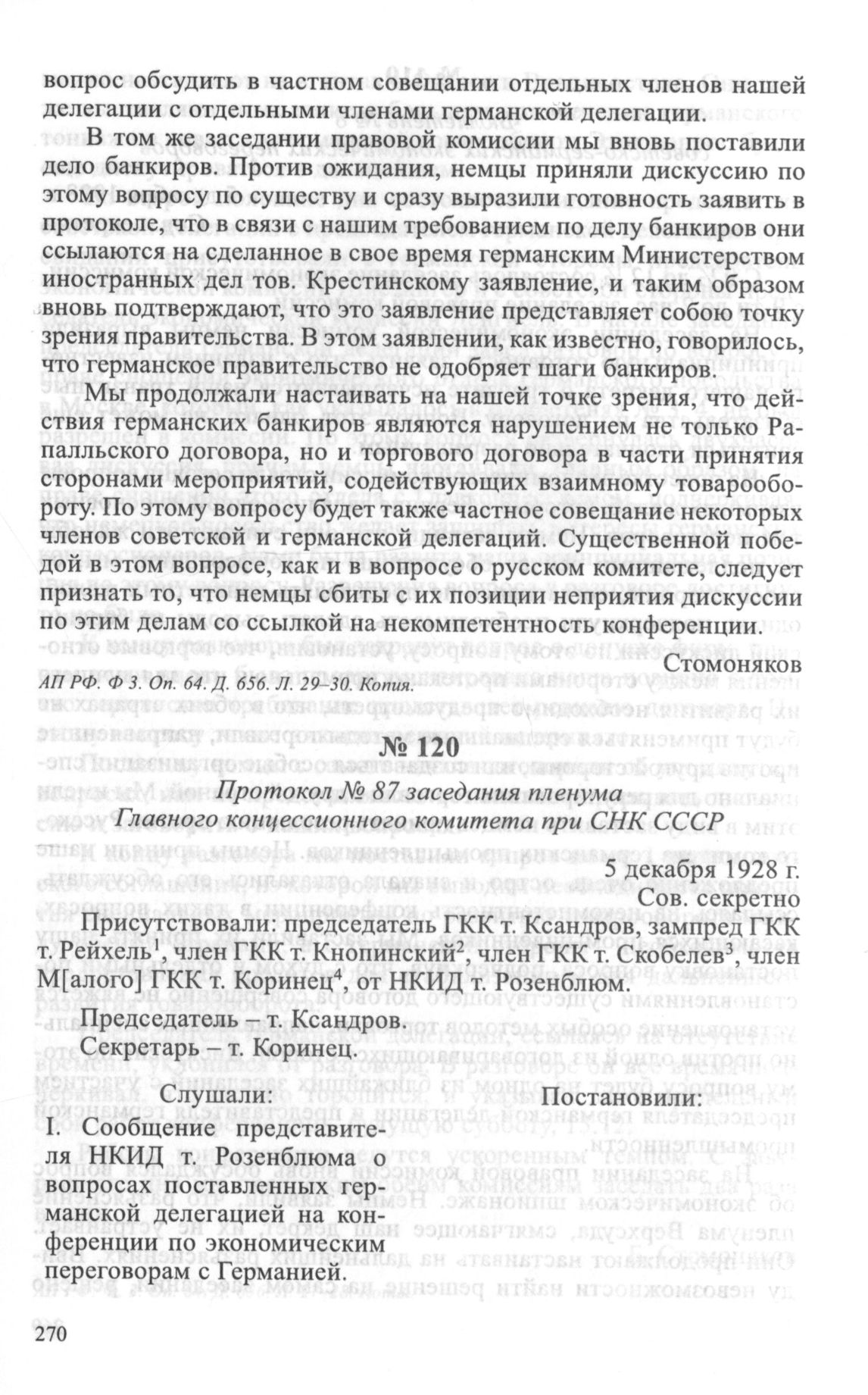 Протокол № 87 заседания пленума Главного концессионного комитета при СНК СССР. 5 декабря 1928 г. // АП РФ. Ф. 3. Oп. 64. Д. 656. Л. 31-31 об. Заверенная копия.