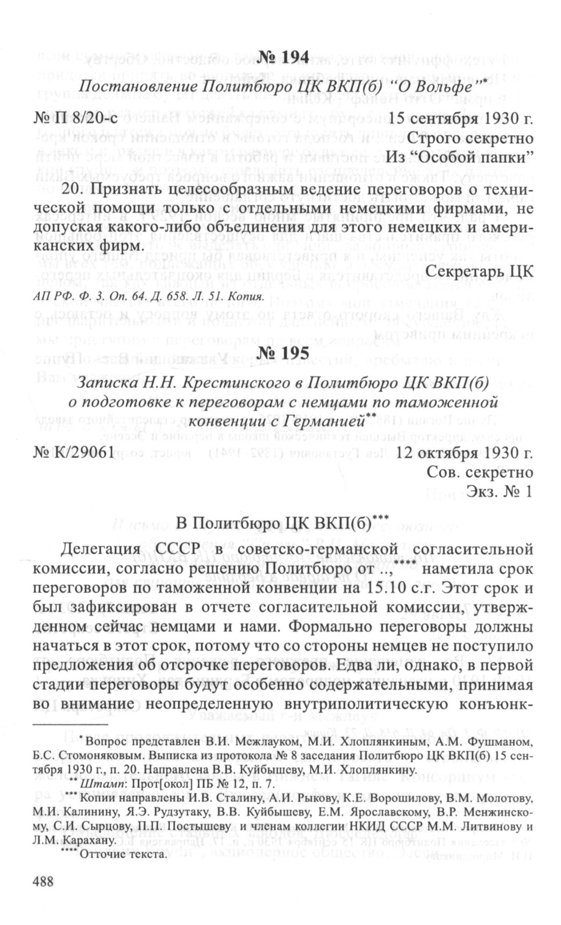 Постановление Политбюро ЦК ВКП(б) “О Вольфе”. 15 сентября 1930 г. // АП РФ. Ф. 3. Oп. 64. Д. 658. Л. 51. Копия.
