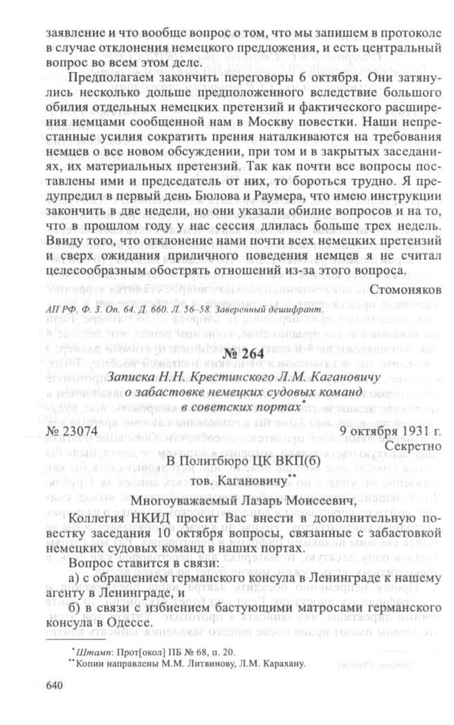 Записка Н.Н. Крестинского Л.М. Кагановичу о забастовке немецких судовых команд в советских портах. 9 октября 1931 г.
