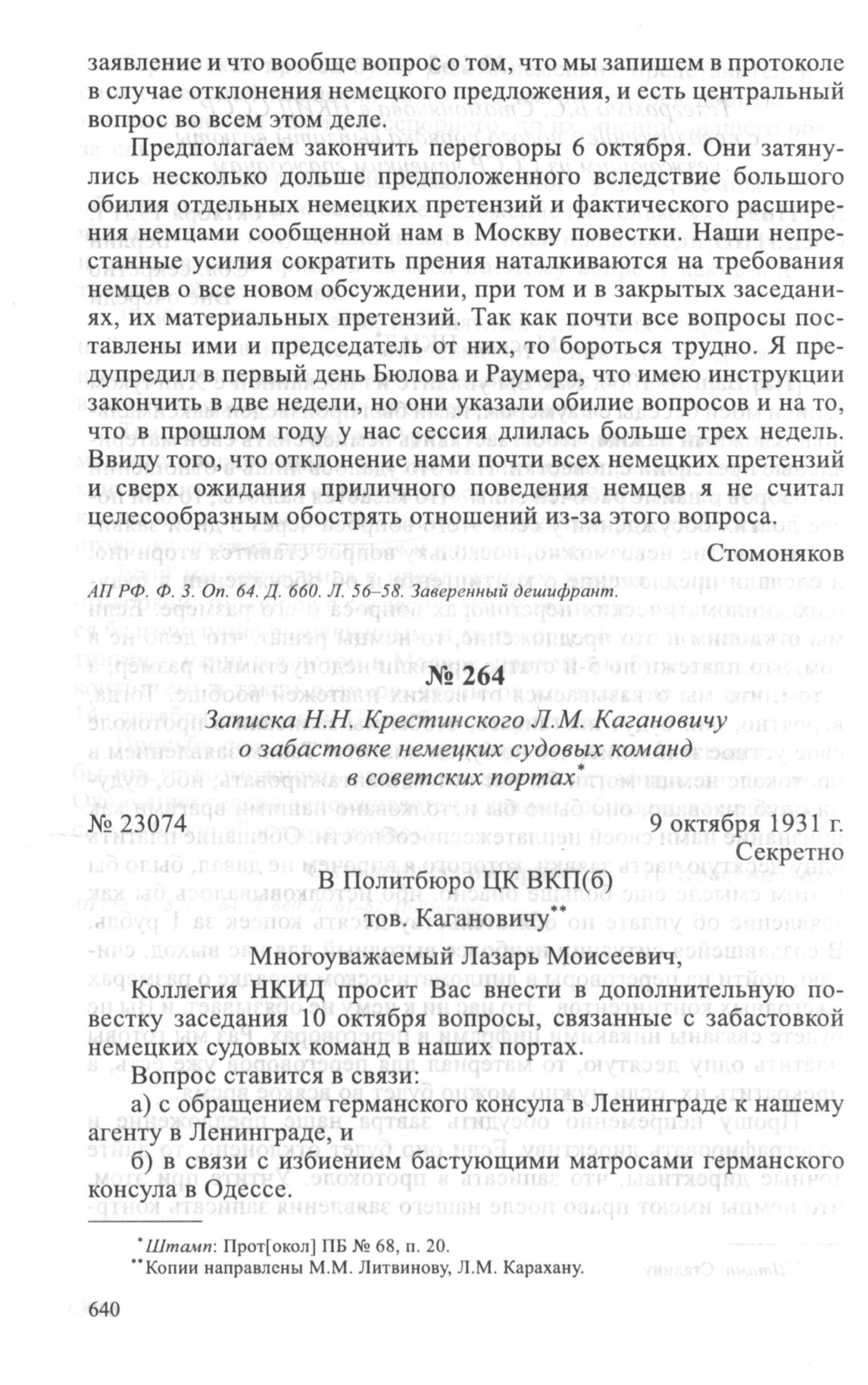 Записка Н.Н. Крестинского Л.М. Кагановичу о забастовке немецких судовых команд в советских портах. 9 октября 1931 г. // АП РФ. Ф. 3. Oп. 64. Д. 677. Л. 9. Подлинник.