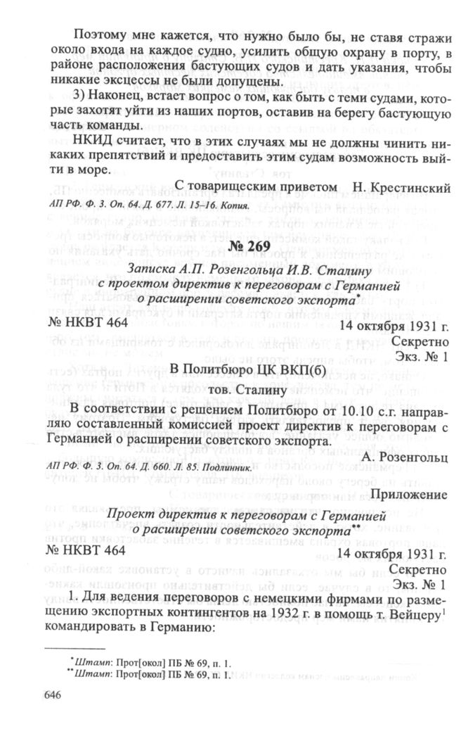 Приложение. Проект директив к переговорам с Германией о расширении советского экспорта. 14 октября 1931 г. // АП РФ. Ф. 3. Oп. 64. Д. 660. Л. 86-88. Подлинник.