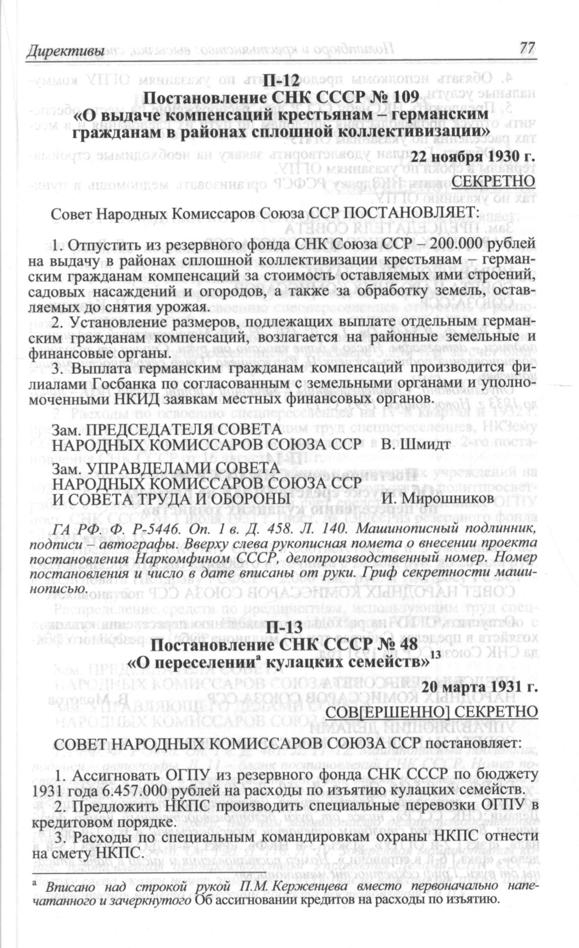 Постановление СНК СССР № 48 «О переселении кулацких семейств». 20 марта 1931 г. // ГА РФ. Ф. P-5446. Oп. 1 в. Д. 459. Л. 148. Машинописный подлинник, подписи - автографы.; Спецпереселенцы в Западной Сибири. Весна 1931 - начало 1933 г. Новосибирск, 1993. С. 13.