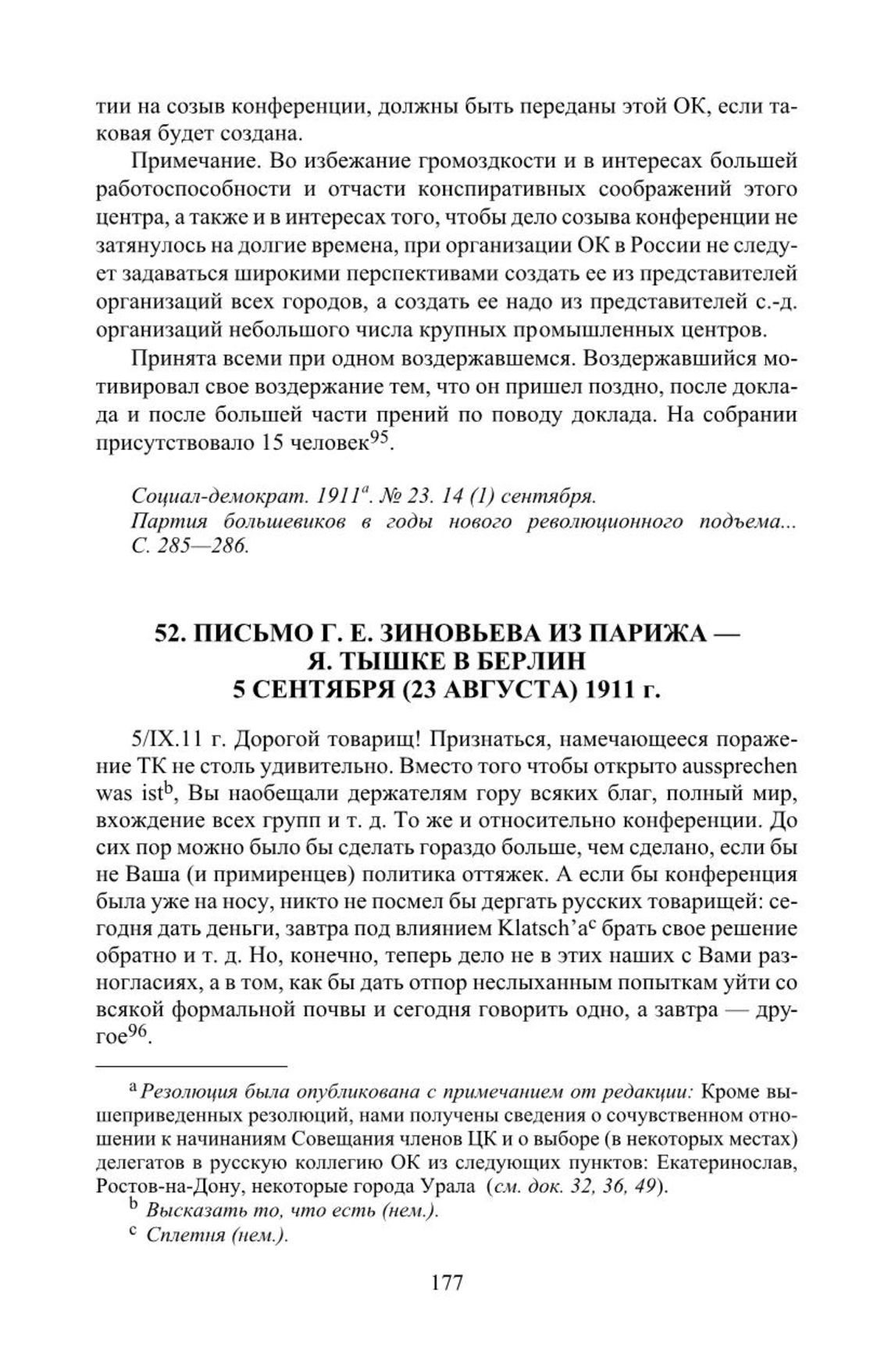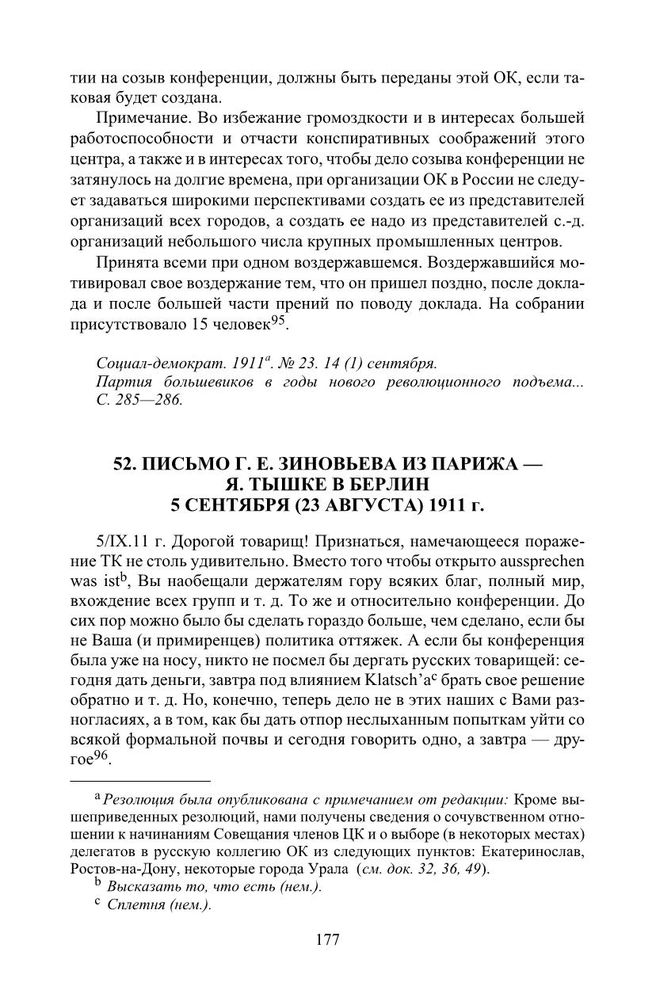 Письмо Г. Е. Зиновьева из Парижа — Я. Тышке в Берлин. 5 сентября (23 августа) 1911 г. // РГАСПИ. Ф. 17. Оп. 1. Ед. хр. 1078. Л. 13—15. Автограф.