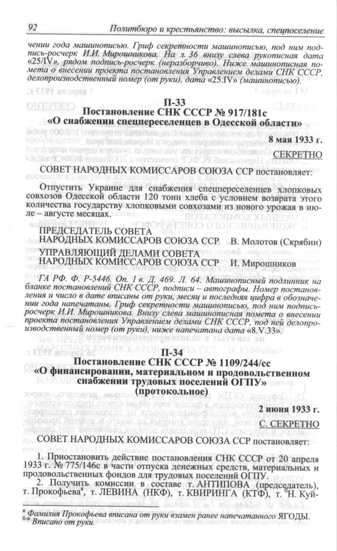 Постановление СНК СССР № 917/181с «О снабжении спецпереселенцев в Одесской области». 8 мая 1933 г. // ГА РФ. Ф. P-5446. Oп. 1 в. Д. 469. Л. 64. Машинописный подлинник на бланке постановлений СНК СССР, подписи - автографы.