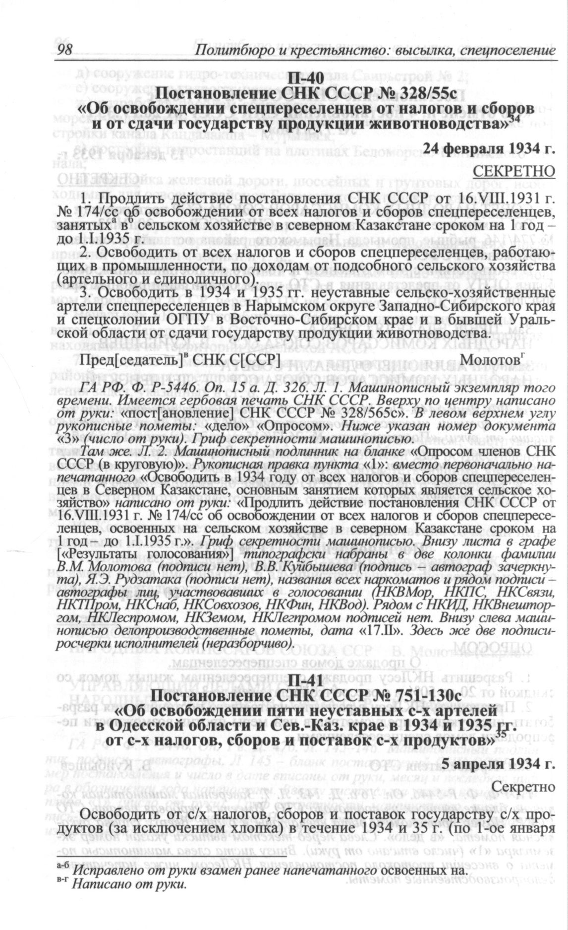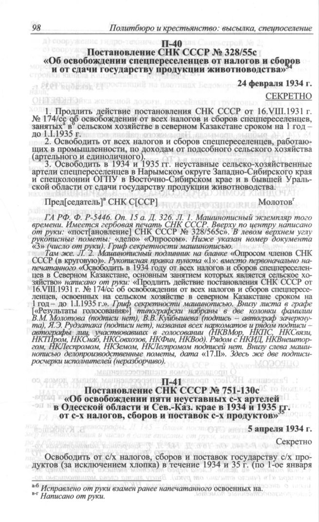 Постановление СНК СССР № 328/55с «Об освобождении спецпереселенцев от налогов и сборов и от сдачи государству продукции животноводства». 24 февраля 1934 г. // ГА РФ. Ф. P-5446. Oп. 15а. Д. 326. Л. 1. Машинописный экземпляр того времени.; ГА РФ. Ф. P-5446. Oп. 15а. Д. 326. Л. 2. Машинописный подлинник на бланке.