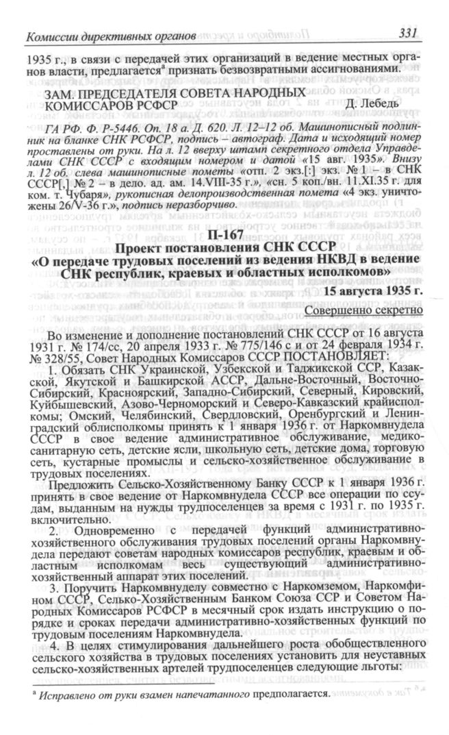 Проект постановления СНК СССР «О передаче трудовых поселений из ведения НКВД в ведение СНК республик, краевых и областных исполкомов». 15 августа 1935 г. // ГА РФ. Ф. Р-5446. Оп. 18а. Д. 620. Л. 13-15. Машинописный подлинник.