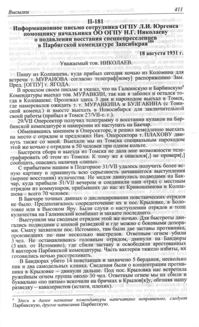 Информационное письмо сотрудника ОГПУ Л.И. Юргенса помощнику начальника ОО ОГПУ Н.Г. Николаеву о подавлении восстания спецпепреселенцев в Парбигской комендатуре Запсибкрая. 18 августа 1931 г. // ЦА ФСБ РФ. Ф. 2. Oп. 9. Д. 551. Л. 159-167. Машинописная копия того времени.