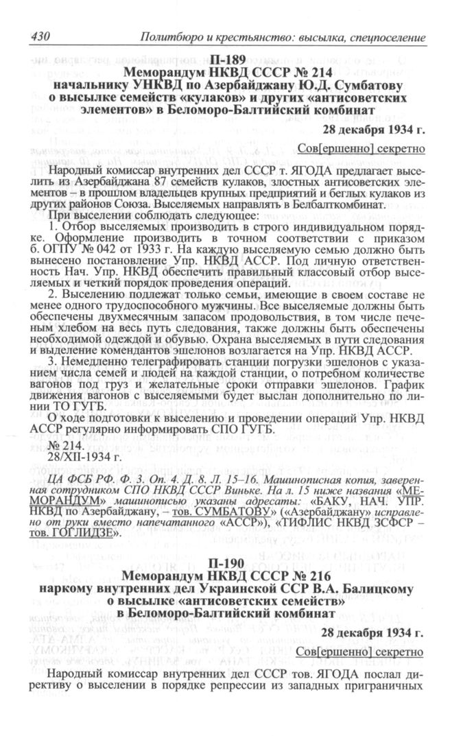 Меморандум НКВД СССР № 214 начальнику УНКВД по Азербайджану Ю.Д. Сумбатову о высылке семейств «кулаков» и других «антисоветских элементов» в Беломорско-Балтийский комбинат. 28 декабря 1934 г. // ЦА ФСБ РФ. Ф. 3. Oп. 4. Д. 8. Л. 15-16. Машинописная копия, заверенная сотрудником СПО НКВД СССР Виньке.