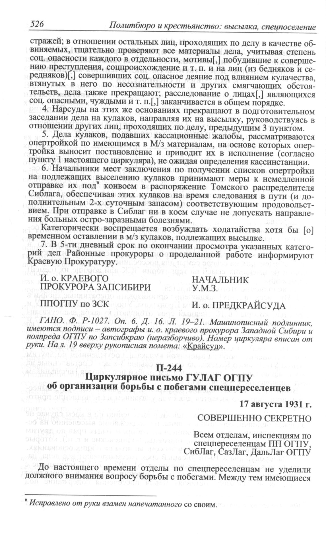 Циркулярное письмо ГУЛАГ ОГПУ об организации борьбы с побегами спецпереселенцев. 17 августа 1931 г. // ГА РФ. Ф. P-9479. Oп. 1. Д. 5. Л. 41-42.; Спецпереселенцы в Западной Сибири. Весна 1931 - начало 1933 г. Новосибирск, 1993. С. 58-60.