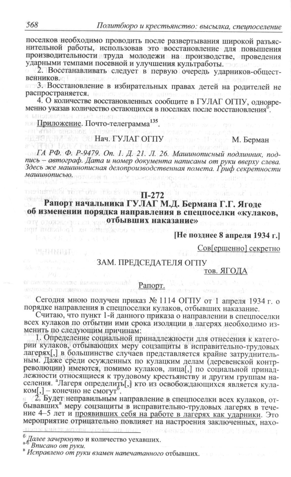 Рапорт начальника ГУЛАГ М.Д. Бермана Г.Г. Ягоде об изменении порядка направления в спецпоселки «кулаков, отбывших наказание». [Не позднее 8 апреля 1934 г.] // ГА РФ. Ф. P-9479. Oп. 1. Д. 24. Л. 4. Машинописный подлинник (черновик) с рукописными правками М.Д. Бермана.