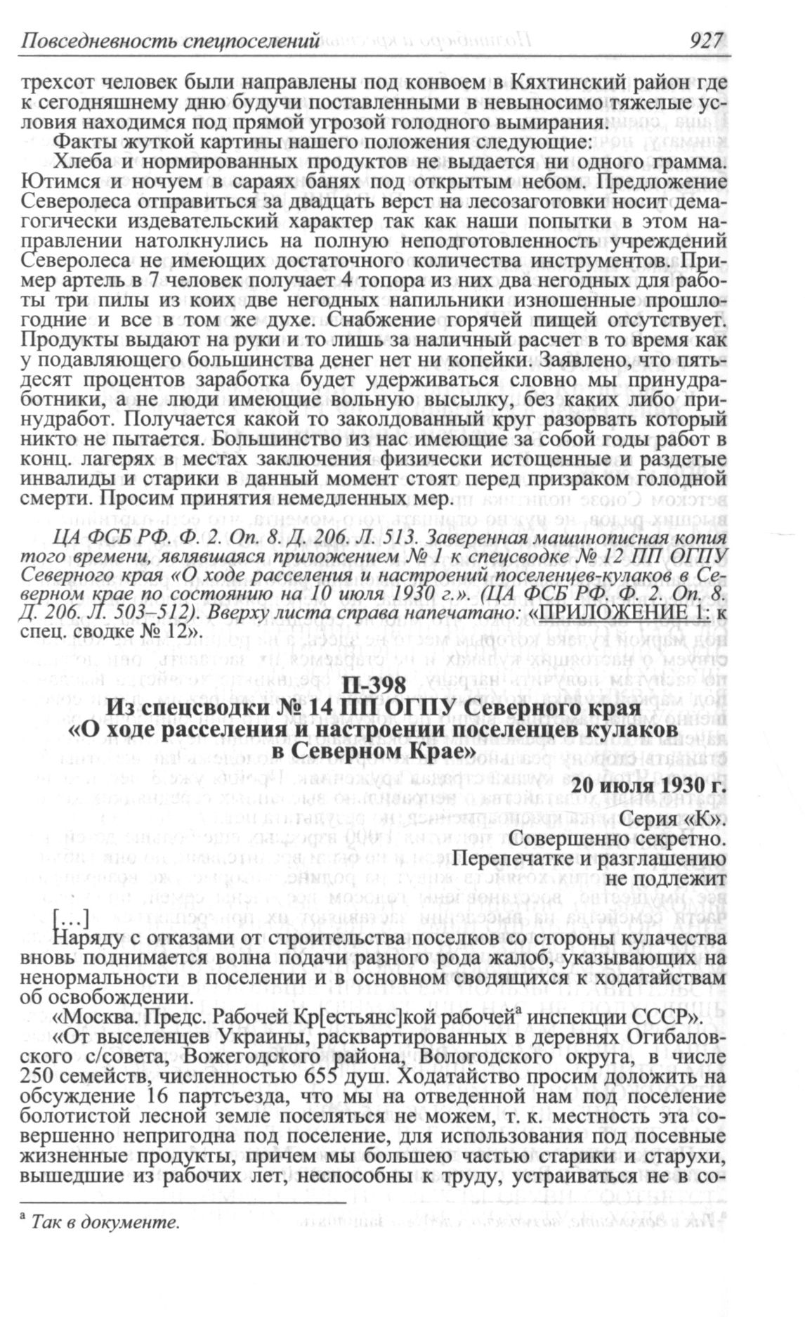 Из спецсводки № 14 ПП ОГПУ Северного края «О ходе расселения и настроении поселенцев кулаков в Северном Крае». 20 июля 1930 г. // ЦА ФСБ РФ. Ф. 2. Оп. 8. Д. 206. Л. 525-526. Машинописная копия того времени.