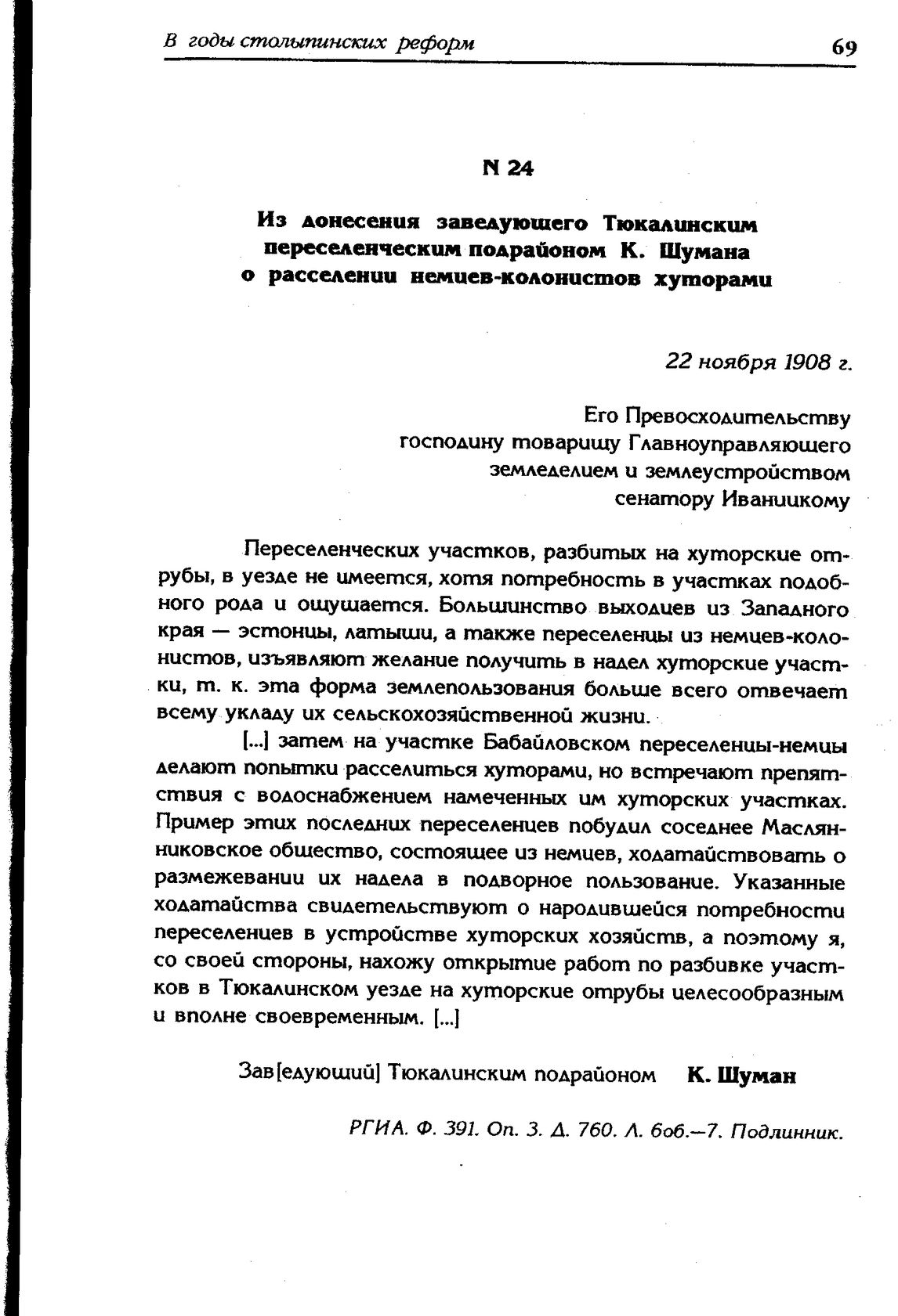Из донесения заведующего Тюкалинским переселенческим подрайоном К. Шумана о расселении немцев-колонистов хуторами. 22 ноября 1908 г.