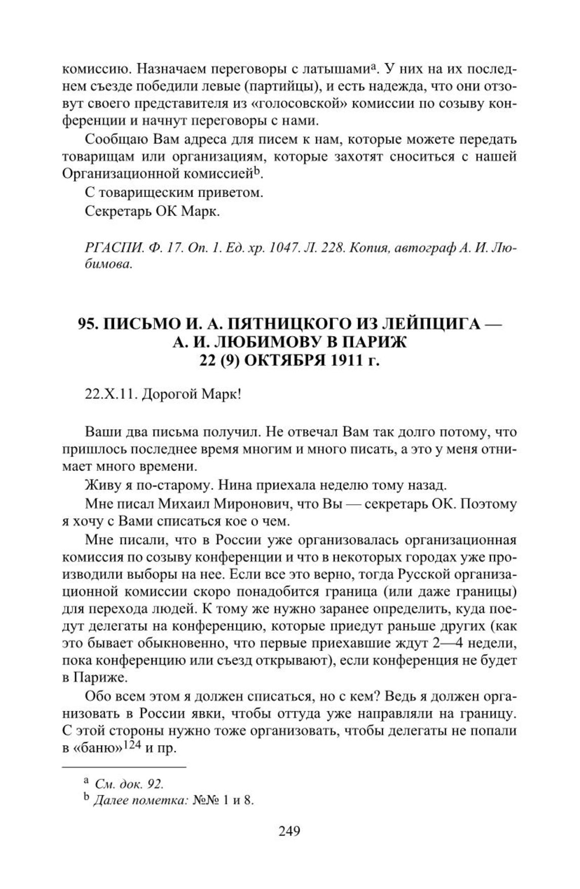 Письмо И. А. Пятницкого из Лейпцига— А. И. Любимову в Париж. 22 (9) октября 1911 г. // РГАСПИ. Ф. 17. Оп. 1. Ед. хр. 1170. Автограф. Исторический архив. 1958. № 5. С. 15.