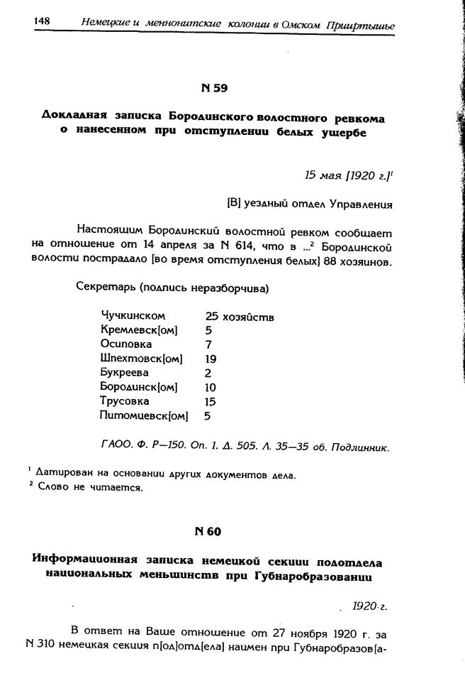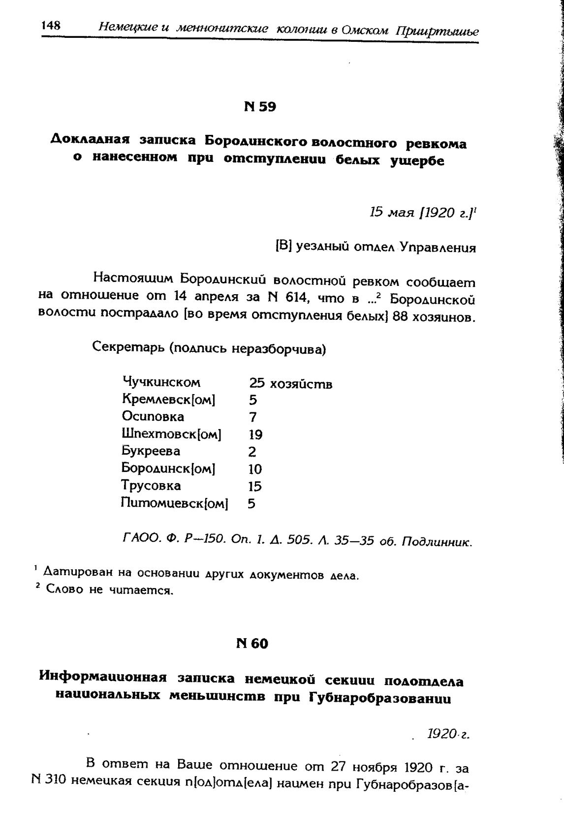 Докладная записка Бородинского волостного ревкома о нанесенном при отступлении белых ущербе. 15 мая 1920 г. // ГАОО. Ф. P-150. Oп. 1. Д. 505. Л. 35-35об. Подлинник.