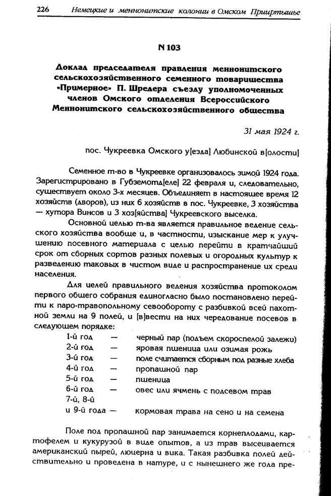 Доклад председателя правления меннонитского сельскохозяйственного семенного товарищества «Примерное» П. Шредера съезду уполномоченных членов Омского отделения Всероссийского Меннонитского сельскохозяйственного общества. 31 мая 1924 г.