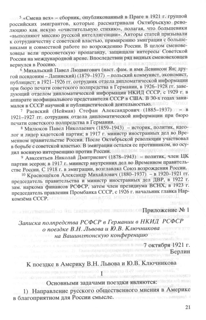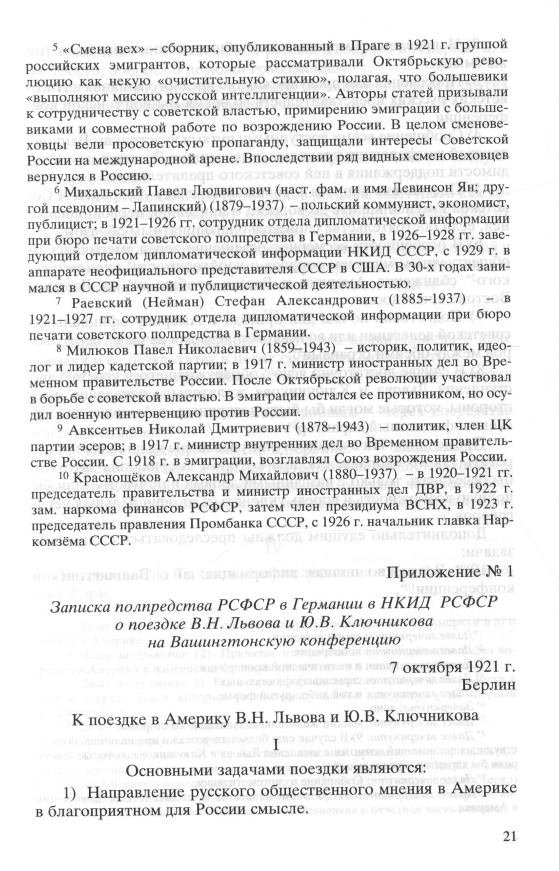 Приложение № 1. Записка полпредства РСФСР в Германии в НКИД РСФСР о поездке В.Н. Львова и Ю.В. Ключникова на Вашингтонскую конференцию. 7 октября 1921 г. // АП РФ. Ф. 3. Оп. 66. Д. 423. Л. 7, 9-10. Копия.