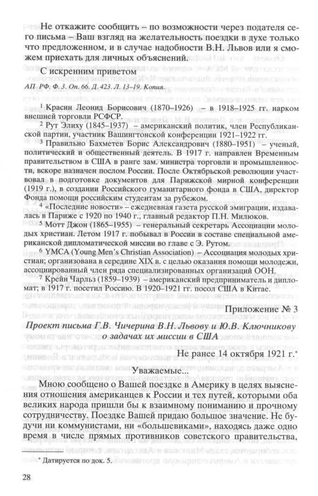 Приложение № 3. Проект письма Г.В. Чичерина В.Н. Львову и Ю.В. Ключникову о задачах их миссии в США. Не ранее 14 октября 1921 г. // АП РФ. Ф. 3. Оп. 66. Д. 423. Л. 6. Копия. Л. 8-9. Черновой автограф.