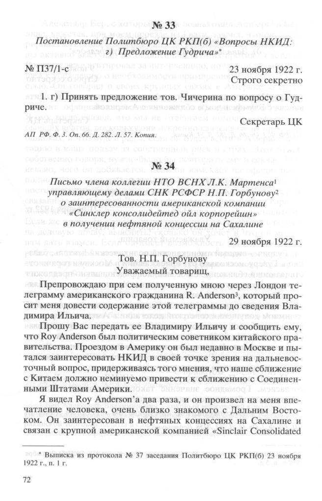 Письмо члена коллегии НТО ВСНХ Л.К. Мартенса управляющему делами СНК РСФСР Н.П. Горбунову о заинтересованности американской компании «Синклер консолидейтед ойл корпорейшн» в получении нефтяной концессии на Сахалине. 29 ноября 1922 г. // АП РФ. Ф. 3. Oп. 66. Д. 282. Л. 59. Копия.