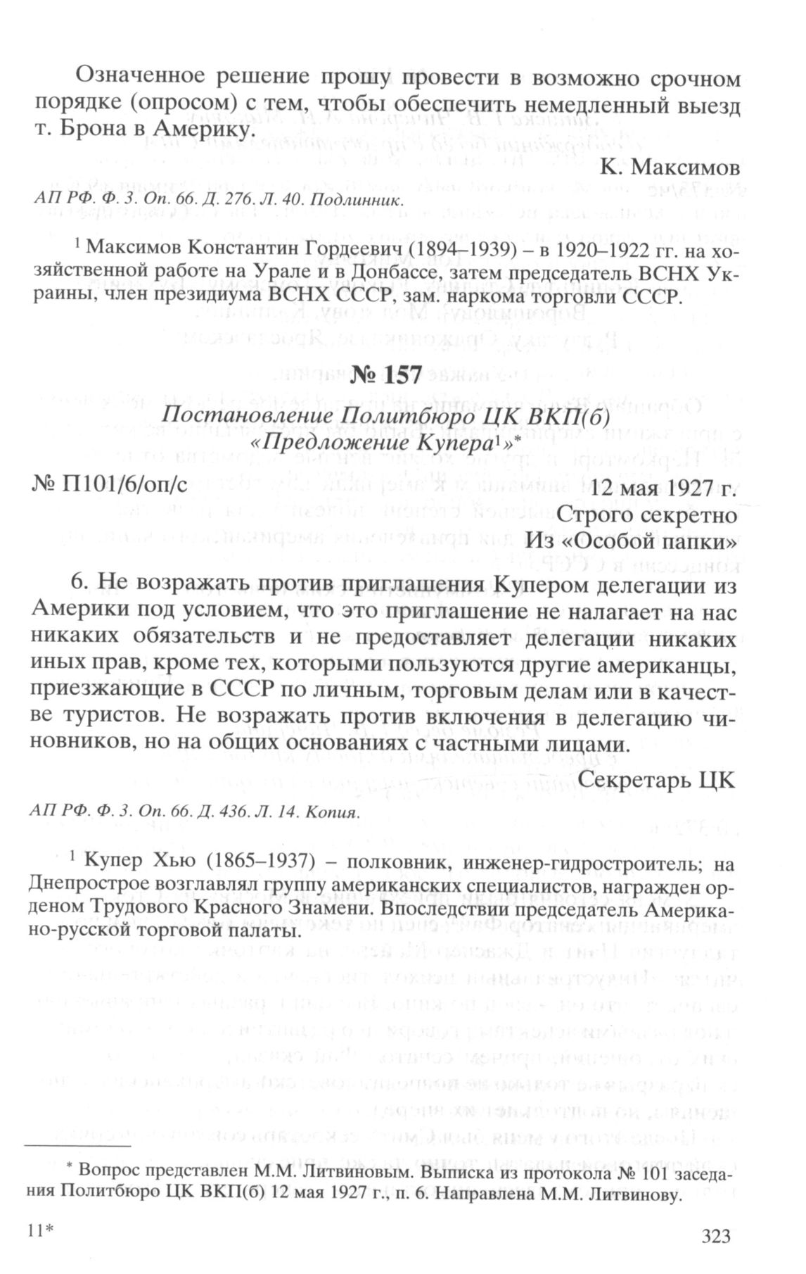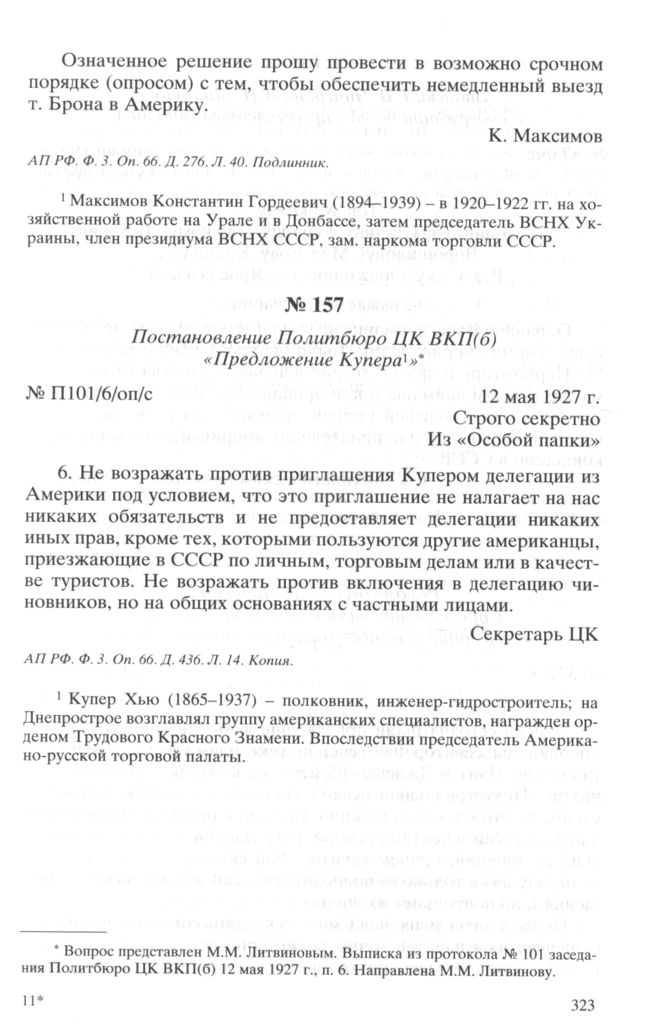 Постановление Политбюро ЦК ВКП(б) «Предложение Купера». 12 мая 1927 г. // АП РФ. Ф. 3. Oп. 66. Д. 436. Л. 14. Копия.