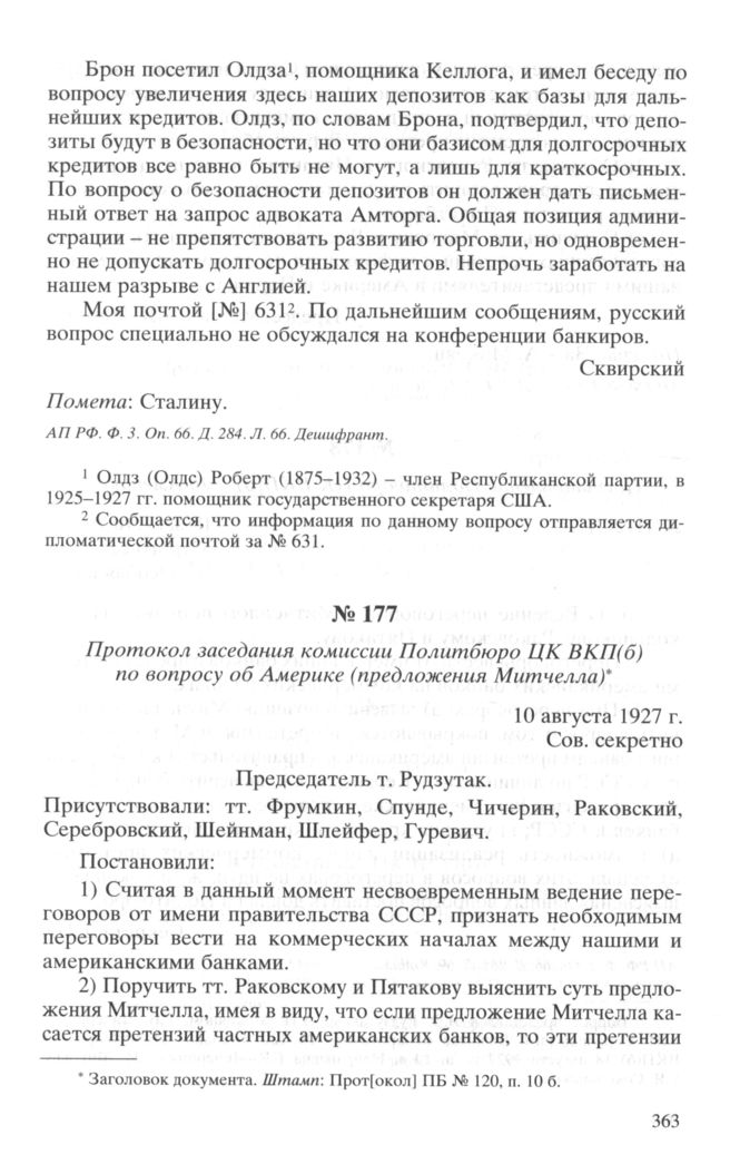 Протокол заседания комиссии Политбюро ЦК ВКП(б) по вопросу об Америке (предложения Митчелла). 10 августа 1927 г. // АП РФ. Ф. 3. Oп. 66. Д. 284. Л. 71. Подлинник.