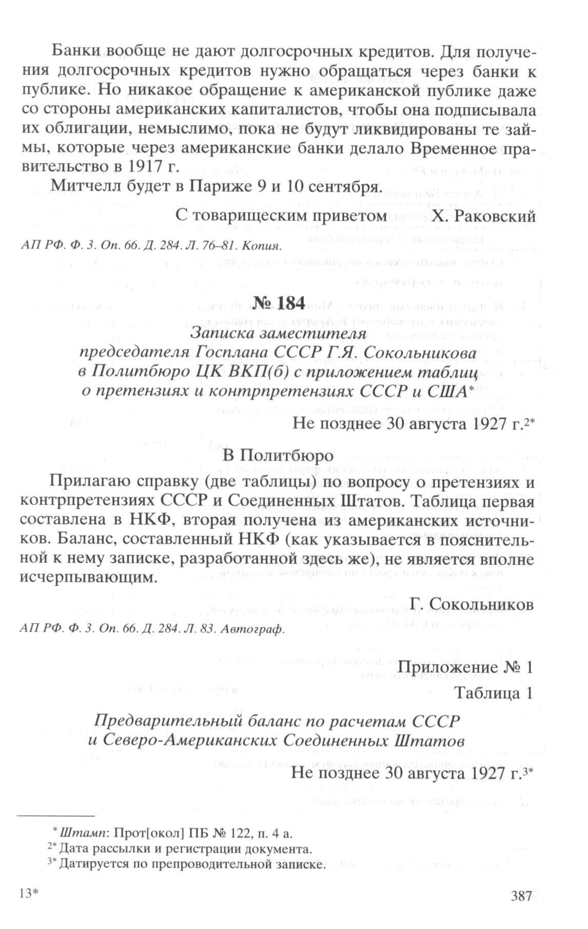 Приложение № 1. Таблица 1. Предварительный баланс по расчетам СССР и Северо-Американских Соединенных Штатов. Не позднее 30 августа 1927 г.
