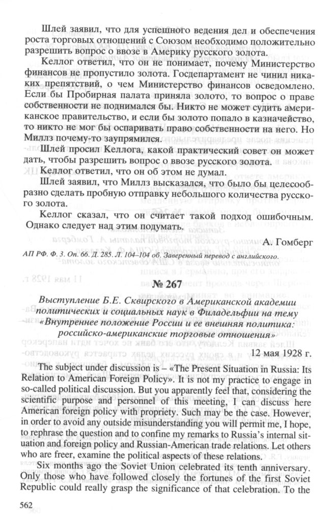 Выступление Б.Е. Сквирского в Американской академии политических и социальных наук в Филадельфии на тему «Внутреннее положение России и ее внешняя политика: российско-американские торговые отношения». 12 мая 1928 г. // АП РФ. Ф. 3. Oп. 66. Д. 288. Л. 1-5. Копия.; The Annals of the American Academy of Political and Social Science. 1 July 1928. Vol. 138. № 1. P. 97-100.