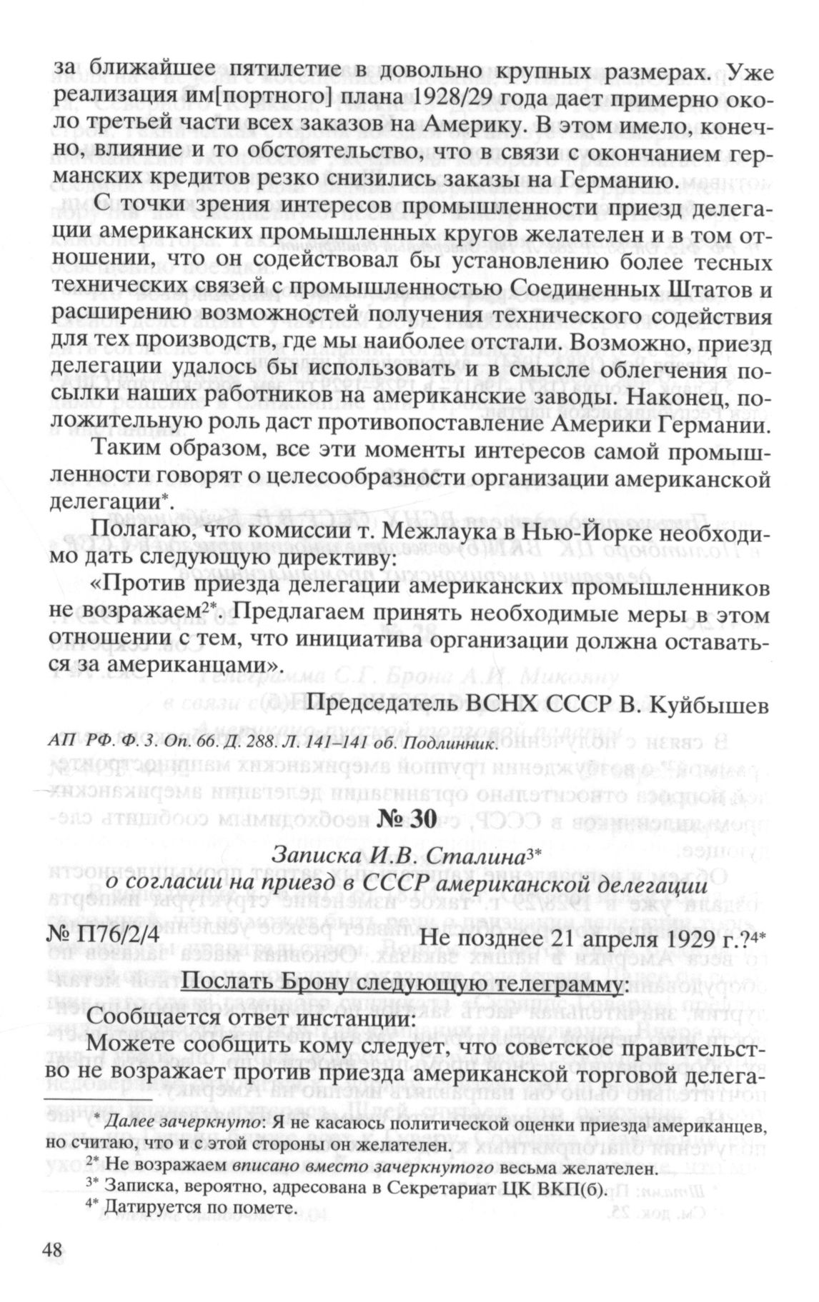 Записка И.В. Сталина о согласии на приезд в СССР американской делегации. Не позднее 21 апреля 1929 г. // АП РФ. Ф. 3. Oп. 66. Д. 288. Л. 136. Заверенная копия.