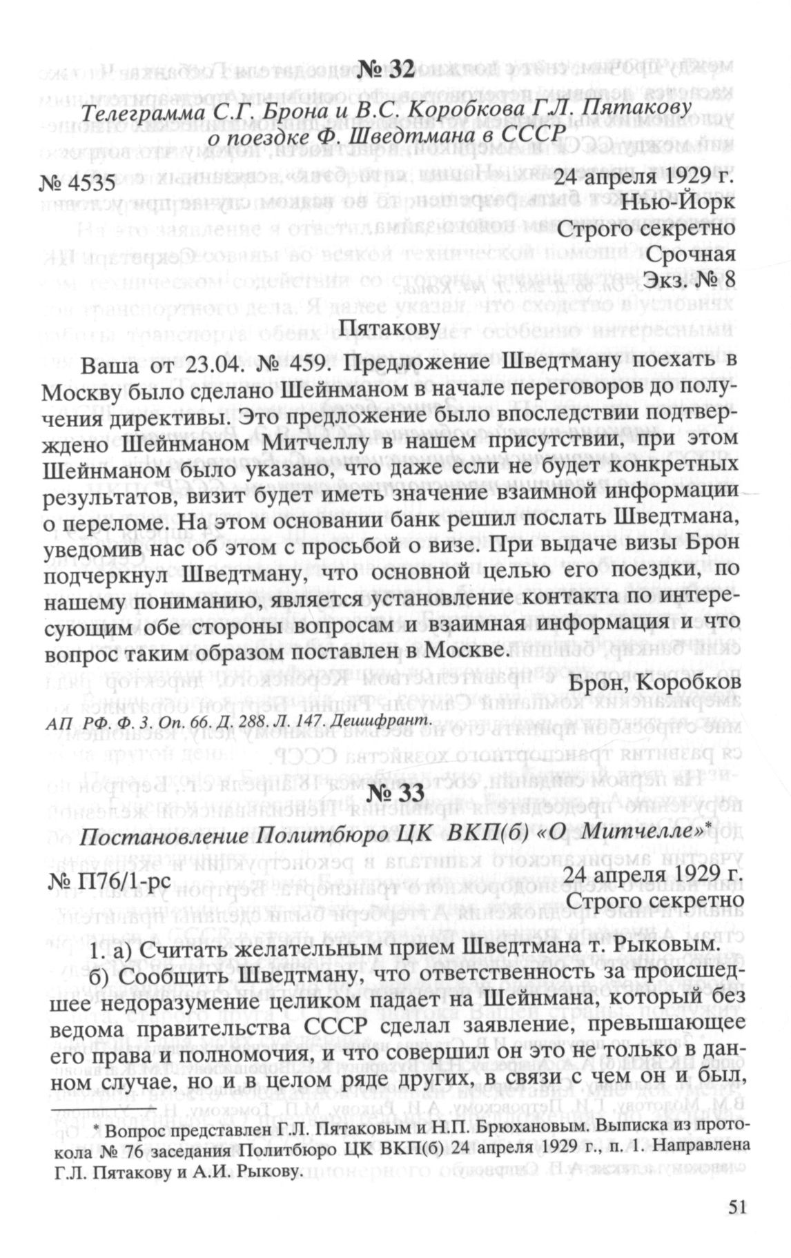 Телеграмма С.Г. Брона и В.С. Коробкова Г.Л. Пятакову о поездке Ф. Шведтмана в СССР. 24 апреля 1929 г. // АП РФ. Ф. 3. Oп. 66. Д. 288. Л. 147. Дешифрант.