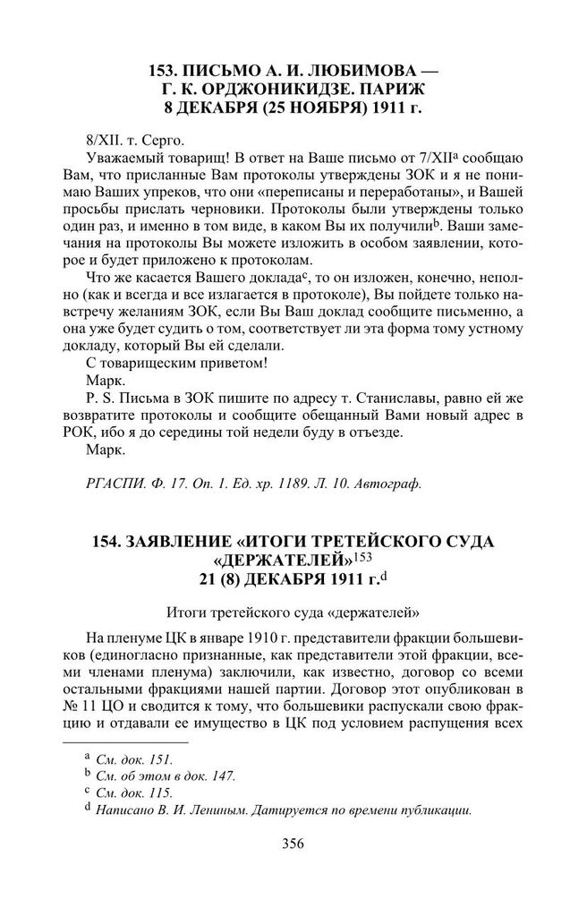 Письмо А. И. Любимова — Г. К. Орджоникидзе. Париж. 8 декабря (25 ноября) 1911 г. // РГАСПИ. Ф. 17. Оп. 1. Ед. хр. 1189. Л. 10. Автограф.