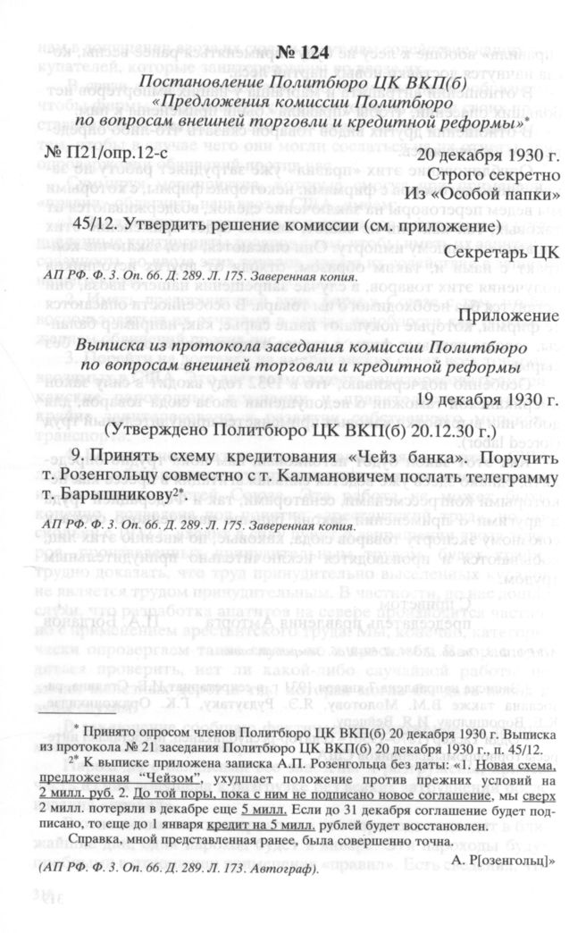 Постановление Политбюро ЦК ВКП(б) «Предложения комиссии Политбюро по вопросам внешней торговли и кредитной реформы». 20 декабря 1930 г. // АП РФ. Ф. 3. Oп. 66. Д. 289. Л. 175. Заверенная копия.