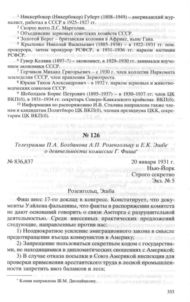 Телеграмма П.А. Богданова А.П. Розенгольцу и Е.К. Эшбе о деятельности комиссии Г. Фиша. 20 января 1931 г. // АП РФ. Ф. 3. Oп. 66. Д. 384. Л. 92. Заверенный дешифрант.